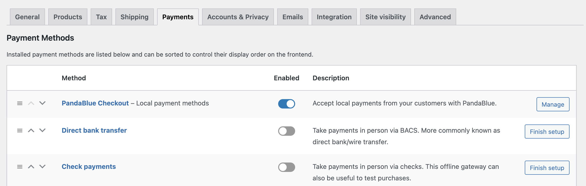 2. Then go to **Payments** and you will see **Pandablue Checkout** on the method list. Click it to configure :smile:<br>