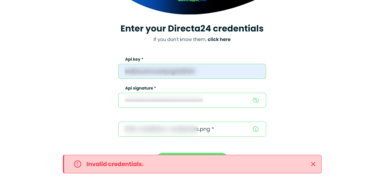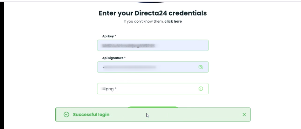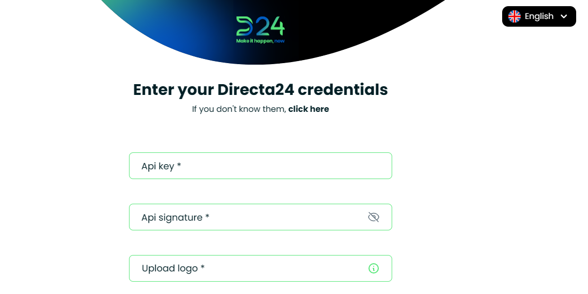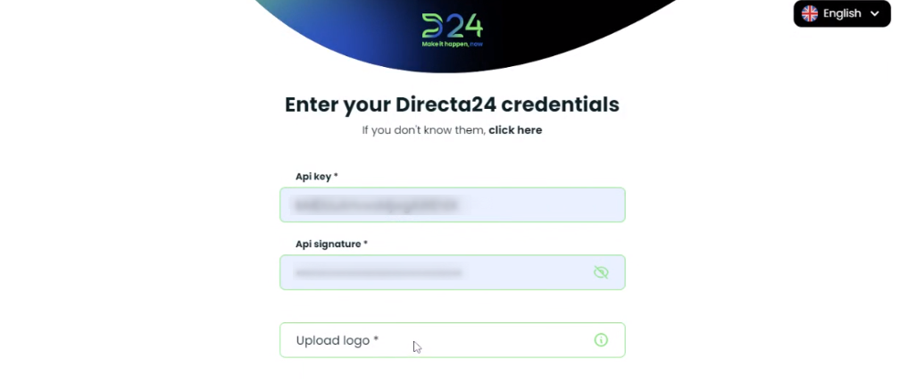 2. In the next screen you must enter the Api Key, and Api Signature. Do not forget to upload the logo!
