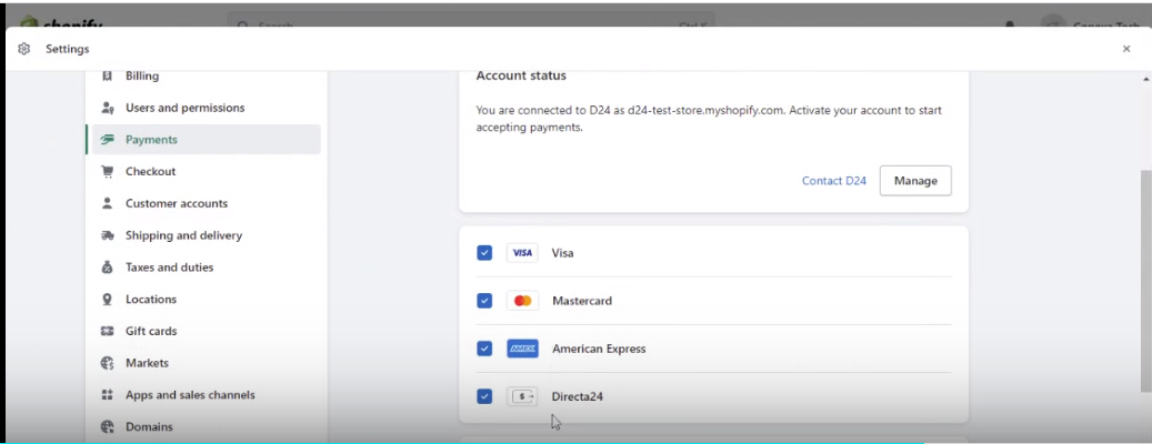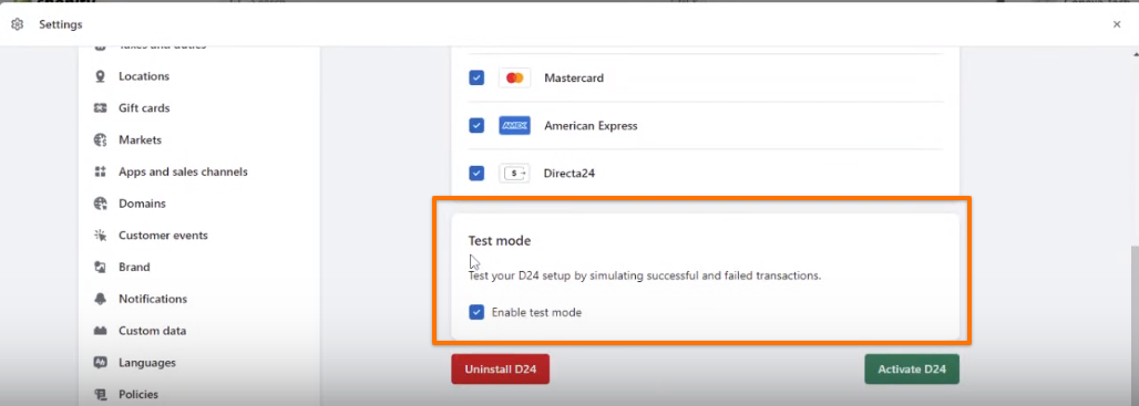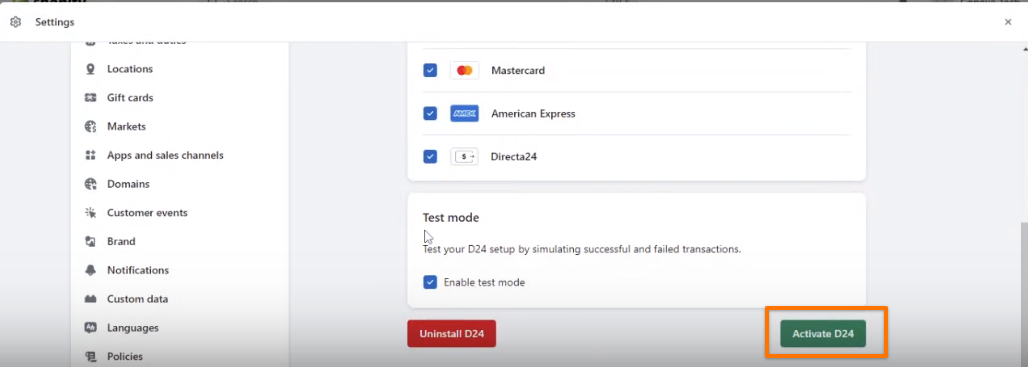 5. It is important that you activate the payment methods you wish to use in order to operate with D24.